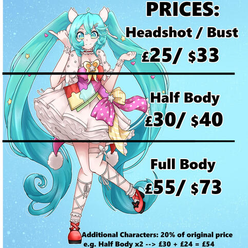 Full body: £55/$73Additional characters = 20% off original price
